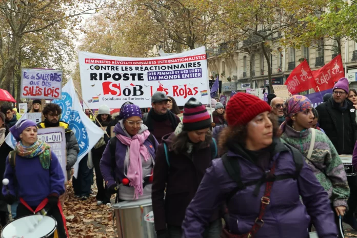 Bravant le froid parisien, nous avons vu plusieurs centaines des femmes avec leurs propres pancartes pour dénoncer la violence de genre, au-delà des pancartes produites par « Nous Toutes » et par « Grève Féministe ». Beaucoup d’entre elles avaient la phrase « Ras le viol », en réponse aux chiffres croissants de viols et de féminicides. Le taux trop élevé des classements sans suite des plaintes pour viol ou leur requalification en simples « agressions sexuelles » provoque un sentiment d’impunité face aux aggreseurs largement partagé dans le mouvement féministe. Las Rojas a mis cette revendication au centre de son appel pour cette année « Toustes dans la rue contre l’impunité » car nous constatons et partageons cette colère contre l’absence de justice pour les victimes.