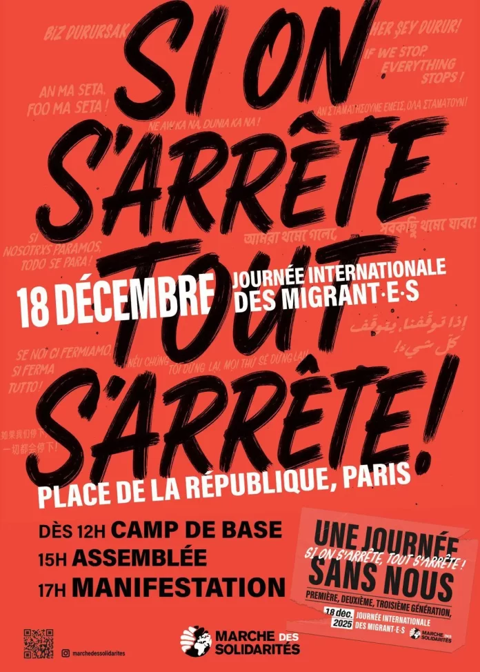 Rejoignons tous et toutes l’appel de la Marche des Solidarités pour « une journée sans nous » le 18 décembre 2025. Ce 18 décembre doit être une journée de soutien aux migrant·es à l’opposé des politiques racistes menées par Macron et soutenues par l’extrême droite. Les collectifs de sans-papiers et de mineur·es isolé·es seront là. Soyons présent·es en masse et portons ensemble nos revendications :